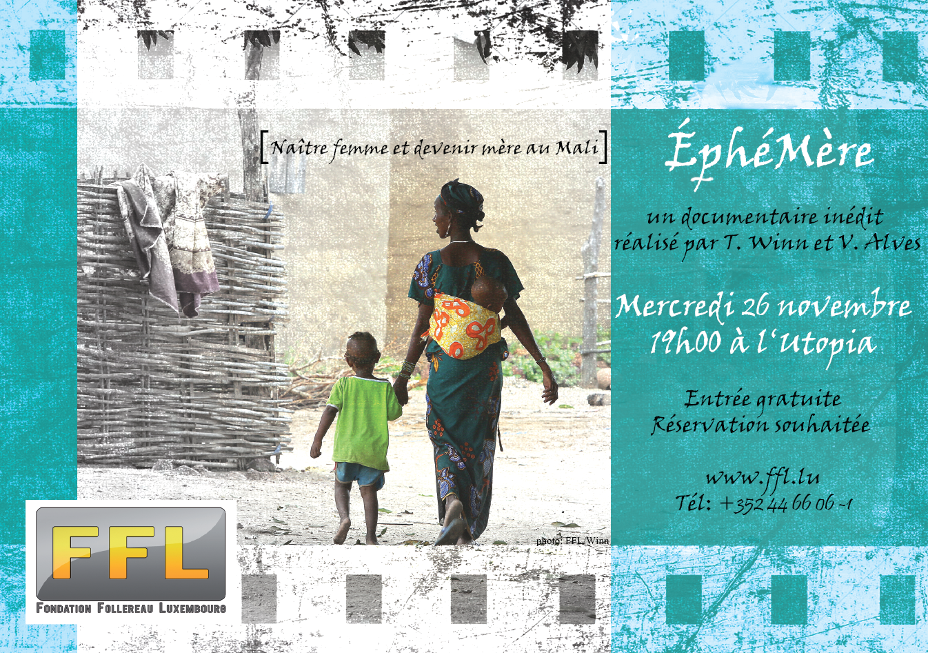 Le Conseil d’administration et l’équipe de la Fondation Follereau Luxembourg (FFL) ont le plaisir de vous inviter à la projection du documentaire FFL inédit « ÉphéMère. Naître femme, devenir mère au Mali ». Ce témoignage en langue française, réalisé par Thierry Winn et Violaine Alves, est diffusé le 26 novembre 2014 à 19h00 au Ciné Utopia (16, av. de la faïencerie, L-1510 Luxembourg).